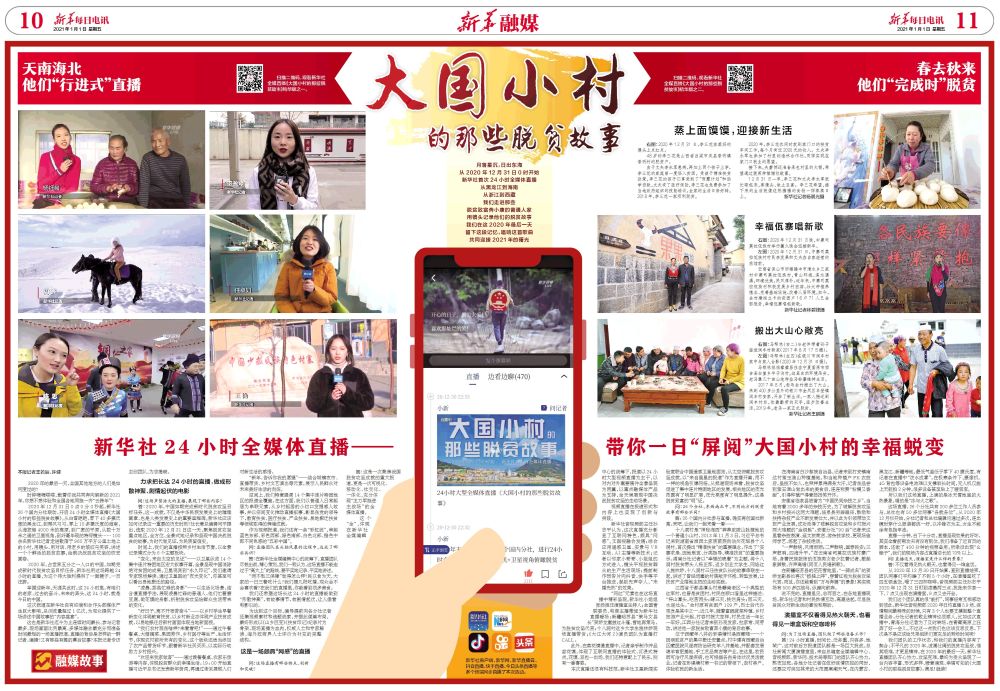 2020年12月31日0點(diǎn)0分0秒起,新華社26個(gè)國內(nèi)分社聯(lián)動(dòng),開啟24小時(shí)全媒體直播《大國小村的那些脫貧故事》。從白雪皚皚、零下40多攝氏度的黑龍江,到椰風(fēng)習(xí)習(xí)、零上10多攝氏度的海南,從海拔超4000米的高原,到廣袤的平原,從數(shù)十萬米之遙的衛(wèi)星視角,到纖毫畢現(xiàn)的特寫鏡頭……100余名新華社記者走進(jìn)散落于960萬平方公里土地上的小村,用鏡頭、用對(duì)話、用老鄉(xiāng)的皺紋與笑容,講述一個(gè)個(gè)鮮活的脫貧故事,繪就決戰(zhàn)脫貧攻堅(jiān)的恢宏畫卷。
