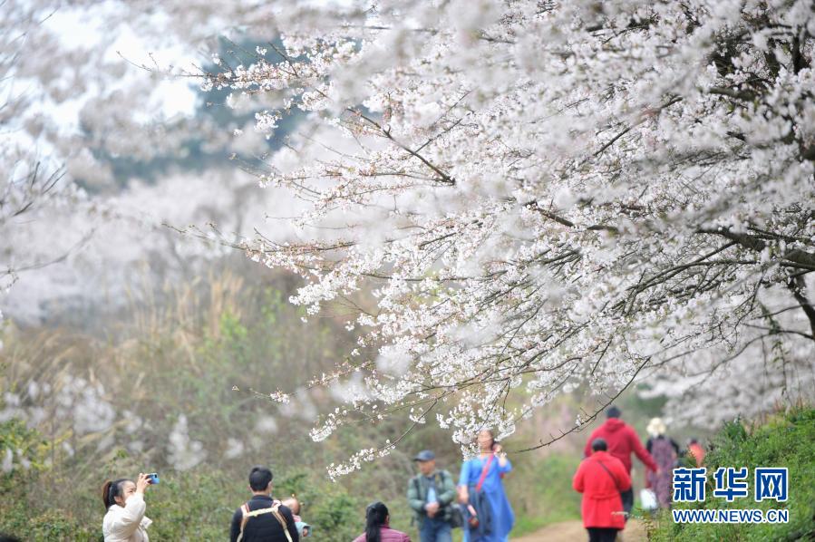 3月11日,游人在貴州省貴安新區(qū)的櫻花園內(nèi)賞花游玩。