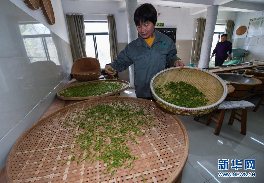3月12日,在杭州市西湖風(fēng)景名勝區(qū)滿覺隴村的中國茶葉博物館滿覺隴炒茶中心內(nèi),茶農(nóng)把西湖龍井茶鮮葉進(jìn)行攤青。