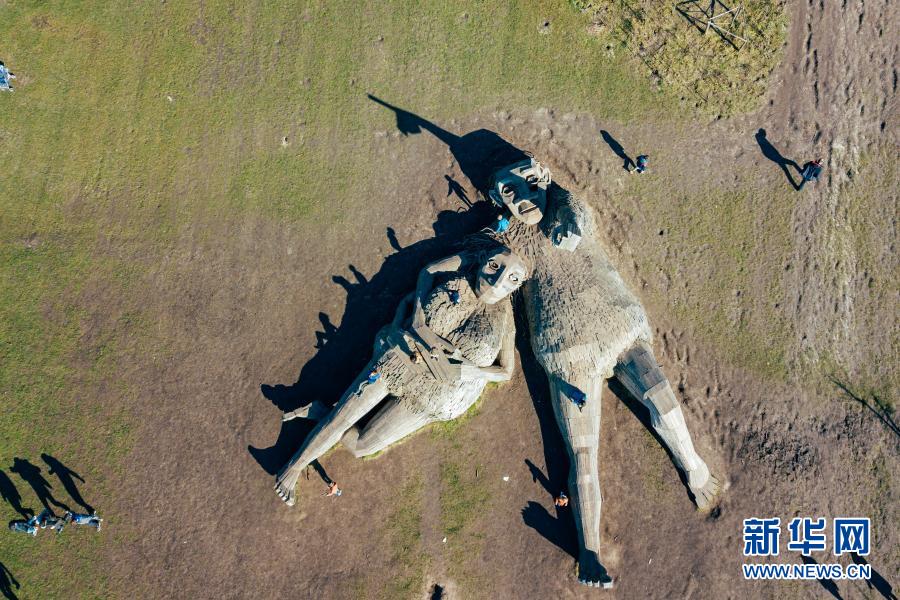 這是3月20日在比利時博姆市的德舒爾森林公園拍攝的“巨人”雕塑(無人機照片)。新華社記者 張鋮 攝