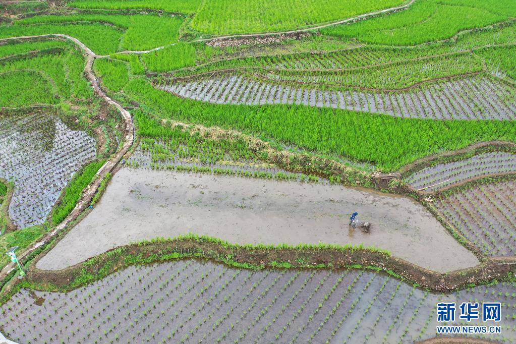 4月5日,村民在浙江省麗水市景寧畬族自治縣大漈鄉(xiāng)梯田里翻耕,以備種植茭苗(無人機照片)。