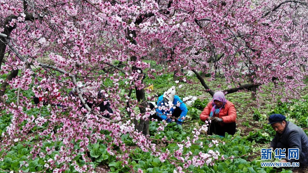 4月6日,甘肅省隴南市宕昌縣城關(guān)鎮(zhèn)玉地河村群眾在桃樹下采挖小白菜。