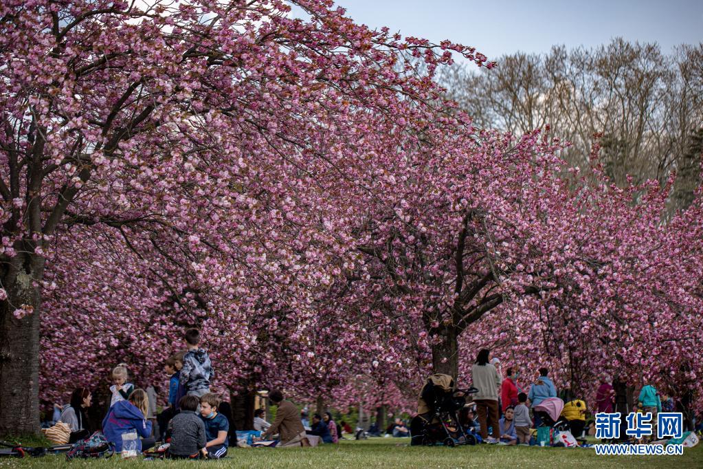 4月20日,人們?cè)诜▏屠杞嫉膰t公園欣賞櫻花。
