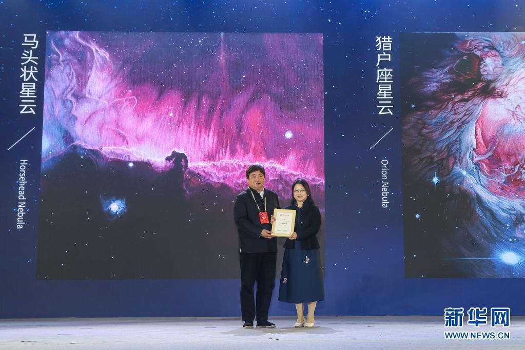 4月24日,在江蘇南京中國航天日主場活動現(xiàn)場,陳英華(右)的“星空”系列蘇繡作品獲得太空探索與藝術(shù)創(chuàng)想大賽特別獎。新華社發(fā)(崔曉 攝)