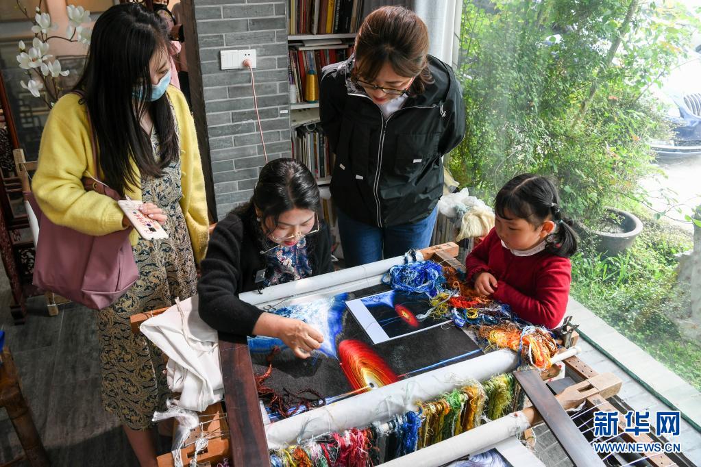 在位于蘇州高新區(qū)鎮(zhèn)湖街道的蘇繡工作室內(nèi),陳英華(右三)為前來(lái)參觀的客人展示蘇繡技法(4月14日攝)。新華社記者 李博 攝