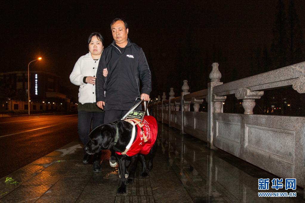 4月11日晚,妻子挽著吳虎剛,吳虎剛牽著“C羅”,共同走在下班回家的路上?! ⌒氯A社發(fā) (張夢(mèng) 攝)
