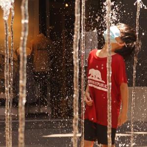 6月16日,美國(guó)加利福尼亞州洛杉磯市民在噴泉旁戲水納涼。加州南部本周迎來今年的首次高溫天氣。