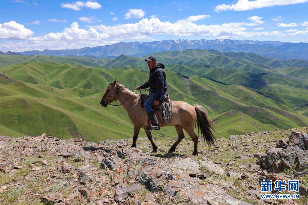 新疆裕民縣的牧民騎馬行進(jìn)在巴爾魯克山區(qū)夏牧場上(6月15日攝)。