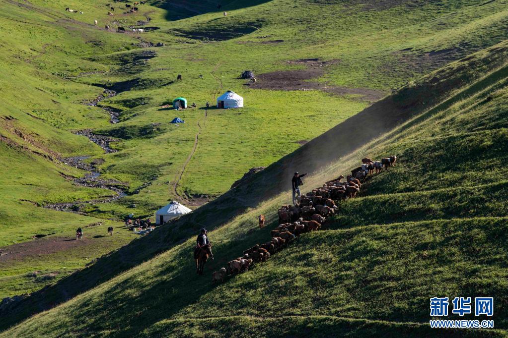 眼下,巴爾魯克山區(qū)的夏牧場迎來放牧黃金季。群山起伏,峰巒翠綠,氈房、牛羊等牲畜分散點(diǎn)綴其間,自駕游客時而穿梭往來,共同譜寫一曲高山夏季牧歌。