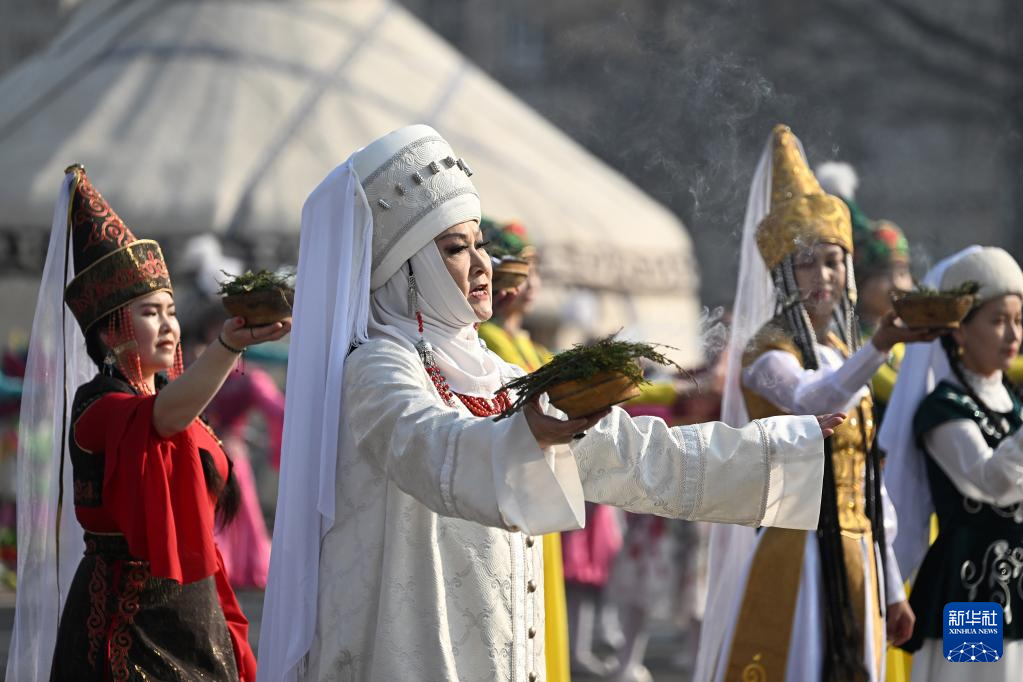 3月21日,人们在吉尔吉斯斯坦首都比什凯克阿拉套广场参加纳乌鲁斯节庆典表演。