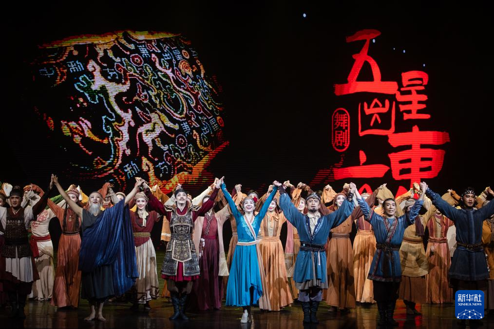当日,舞剧《五星出东方》在武汉市湖北剧院上演。该剧的构想源于从我国新疆和田尼雅遗址出土的国家一级文物“五星出东方利中国”汉代织锦护臂。