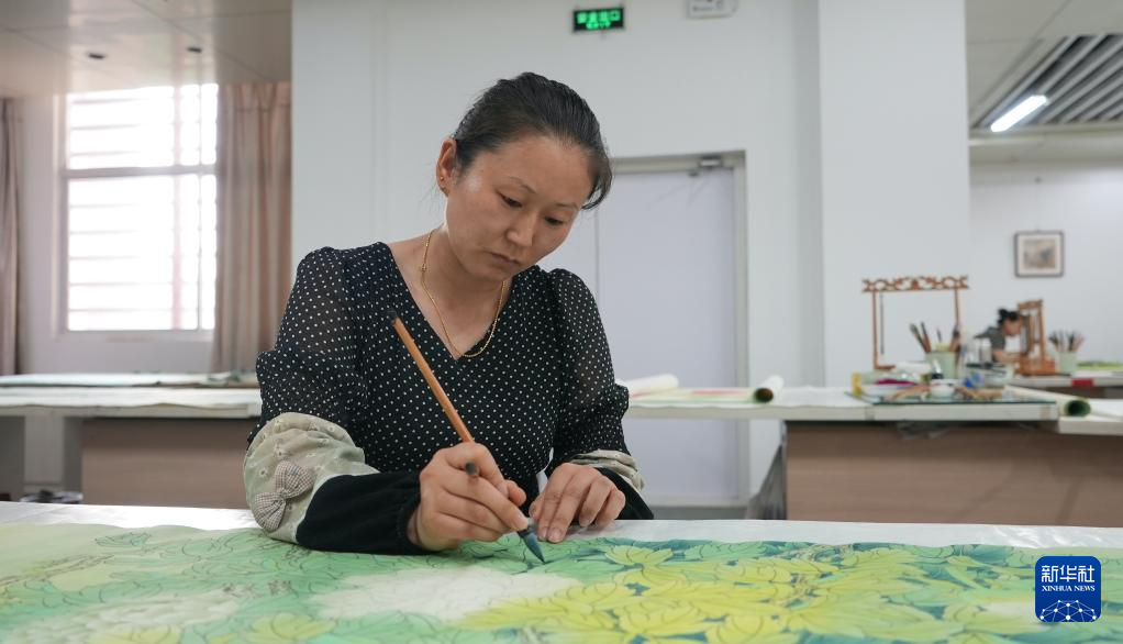 7月24日,画师在山东省巨野县书画院绘制工笔画作品。