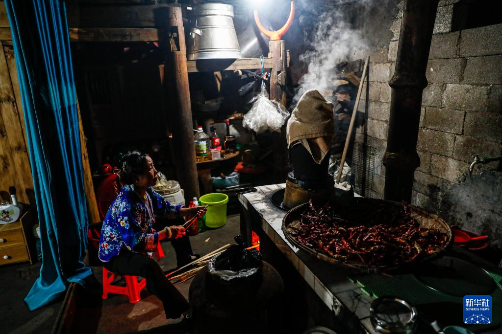 乌英苗寨妇女梁足英在蒸布(2023年8月30日摄)。