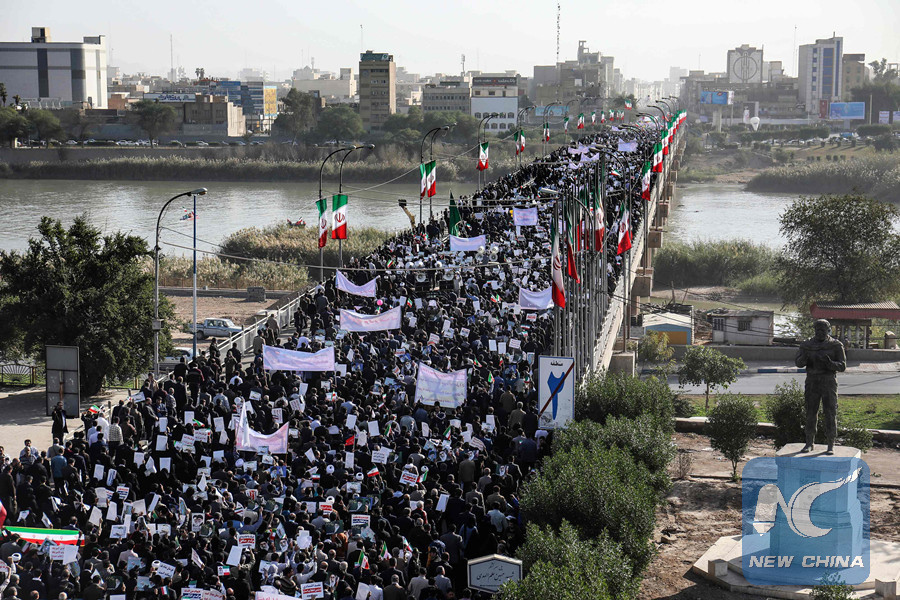 Pro-government demonstrators march in Iran's southwestern city of Ahvaz on January 3, 2018, as tens of thousands gathered across Iran in a massive show of strength for the Islamic rulers after days of deadly unrest. (AFP PHOTO)