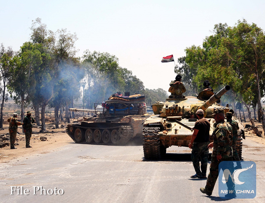 Photo taken on July 22, 2018 from the strategic Tal Al-Jabiyeh hill shows Syrian tanks moving toward the Tal Al-Jumou hill that is under the Islamic State (IS) control in the southern province of Daraa, Syria. (Xinhua/Ammar Safarjalani)