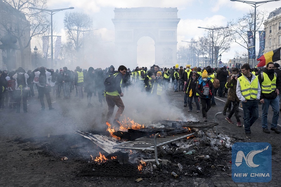 PARIS, March 18 (Xinhua) -- French President Emmanuel Macron has vowed to take "strong decisions" to prevent weekly "Yellow Vest" protests from turning violent after rioters ran amok across Paris on Saturday.