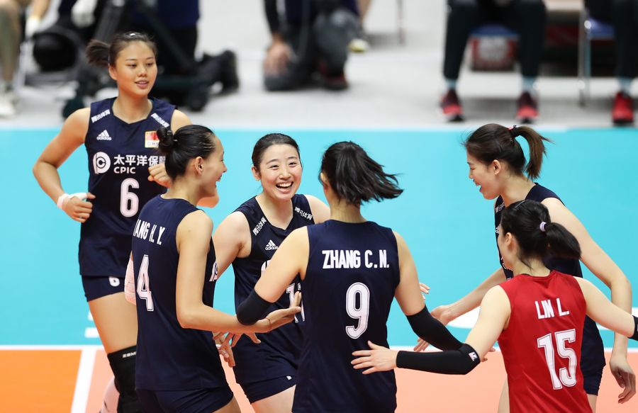 Players of China celebrate during the Round Robin match between China and Kenya at the 2019 FIVB Women's World Cup in Sapporo, Japan, Sept. 24, 2019. (Xinhua/Du Xiaoyi)