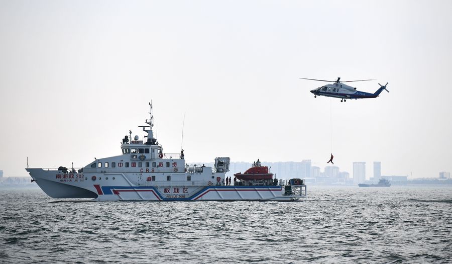 A helicopter participates in the Qiongzhou Strait ro-ro passenger ships joint rescue exercise in Haikou, south China's Hainan Province, Sept. 24, 2019. (Xinhua/Guo Cheng)