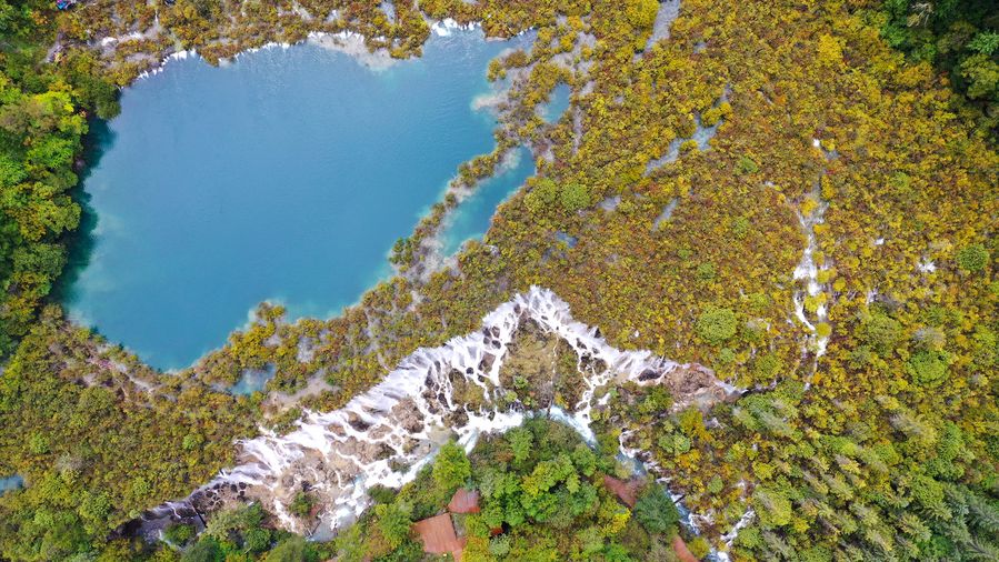 Aerial photo taken on Sept. 23, 2019 shows a view of Nuorilang Waterfall in the Jiuzhaigou National Park in southwest China's Sichuan Province. Part of the Jiuzhaigou National Park in southwest China's Sichuan Province will reopen to visitors on Friday on a trial basis, over two years after it was hit by a powerful earthquake, local authorities said Monday. (Photo by Wang Xi/Xinhua)