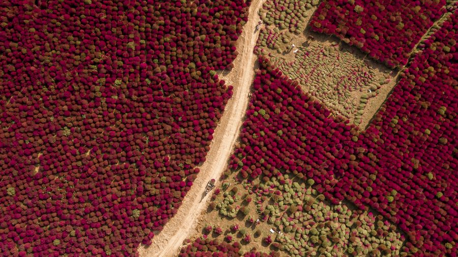 Aerial photo taken on Sept. 23, 2019 shows villagers working in a broomsedge field in Caojiagou Village of Liulin County, north China's Shanxi Province. (Photo by Liu Liangliang/Xinhua)