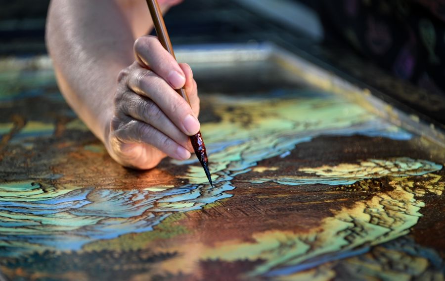 Hu Xin works on a gold lacquer painting at Beijing Gold Lacquer Inlaid Co., Ltd. in Beijing, capital of China, Sept. 19, 2019. Gold inlaid lacquer, an integral part of painted and inlaid lacquer, is among the eight Beijing-style handicrafts. Gold inlaid lacquer ware combines the intricate skills of carving, filling, whetting, inlaying and painting. It features a gold lacquered surface inlaid with various gems and other exotic materials. (Xinhua/Li Xin)