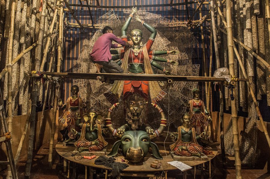 An artisan gives finishing touches to a semi-finished idol for the upcoming Durga Puja festival in Kolkata, India on Sept. 23, 2019. Durga Puja is one of the largest Hindu festivals that involves worship of Goddess Durga symbolizing power and triumph of good over evil in Hindu mythology. (Xinhua/Tumpa Mondal)