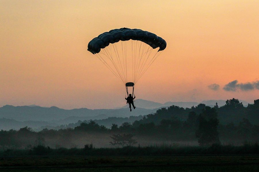 A soldier from the Armed Forces of the Philippines (AFP) uses a parachute during the DAGIT-PA (sea, air, land) military exercise inside Fort Magsaysay in Nueva Ecija province, the Philippines, Sept. 23, 2019. The AFP held a combined military exercise to improve the inter-operability between the main service branches: the Army, the Navy and the Air Force. (Xinhua/Rouelle Umali)