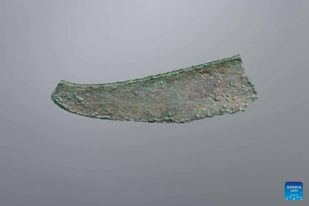 This undated file photo shows a bronze knife dating back to the Western Zhou Dynasty (1046 BC-771 BC), found at the Jiangliu Site in Jingyang County, northwest China's Shaanxi Province. (Shaanxi Academy of Archaeology/Handout via Xinhua)