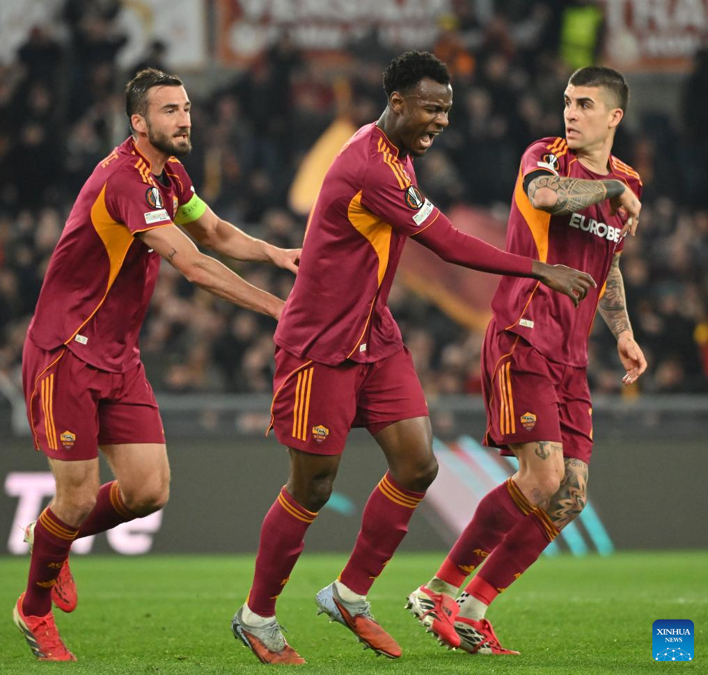 Roma's Evan Ndicka (C) celebrates his goal during the UEFA Europa League round of 16 second leg match between Roma and Bologna in Rome, Italy, March 19, 2026. (Photo by Alberto Lingria/Xinhua)