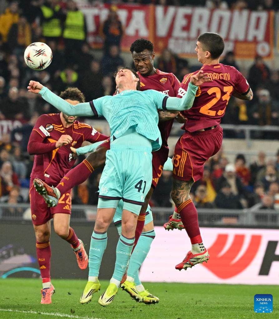 Roma's Evan Ndicka (2nd R) heads to score during the UEFA Europa League round of 16 second leg match between Roma and Bologna in Rome, Italy, March 19, 2026. (Photo by Alberto Lingria/Xinhua)