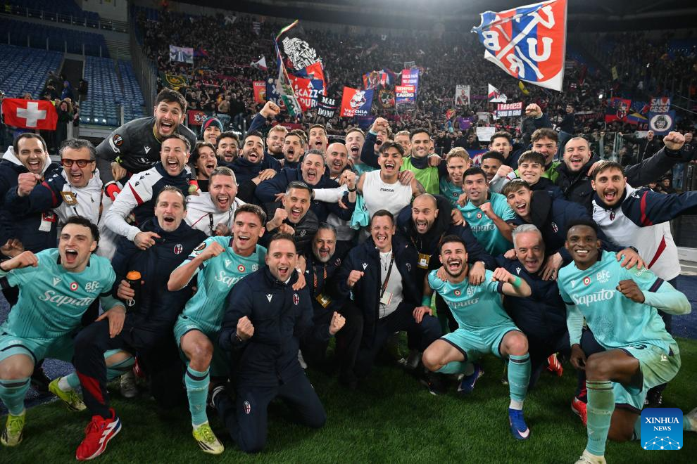 Players of Bologna celebrate after the UEFA Europa League round of 16 second leg match between Roma and Bologna in Rome, Italy, March 19, 2026. (Photo by Alberto Lingria/Xinhua)