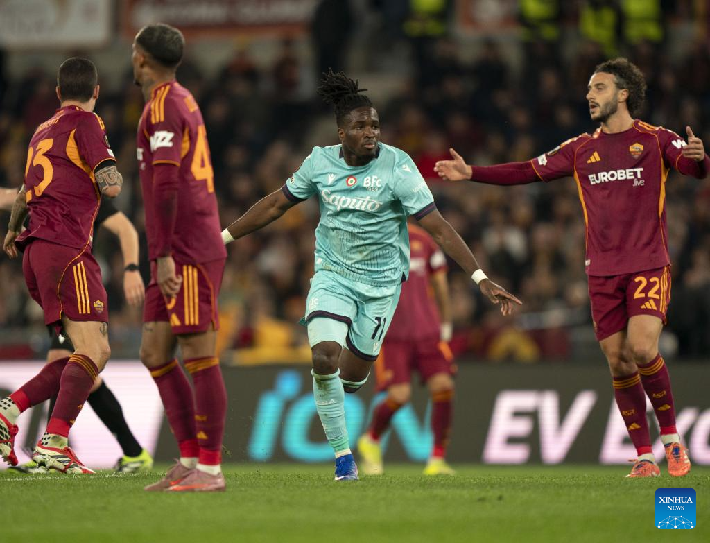 Bologna's Jonathan Rowe (C) celebrates his goal during the UEFA Europa League round of 16 second leg match between Roma and Bologna in Rome, Italy, March 19, 2026. (Photo by Alberto Lingria/Xinhua)