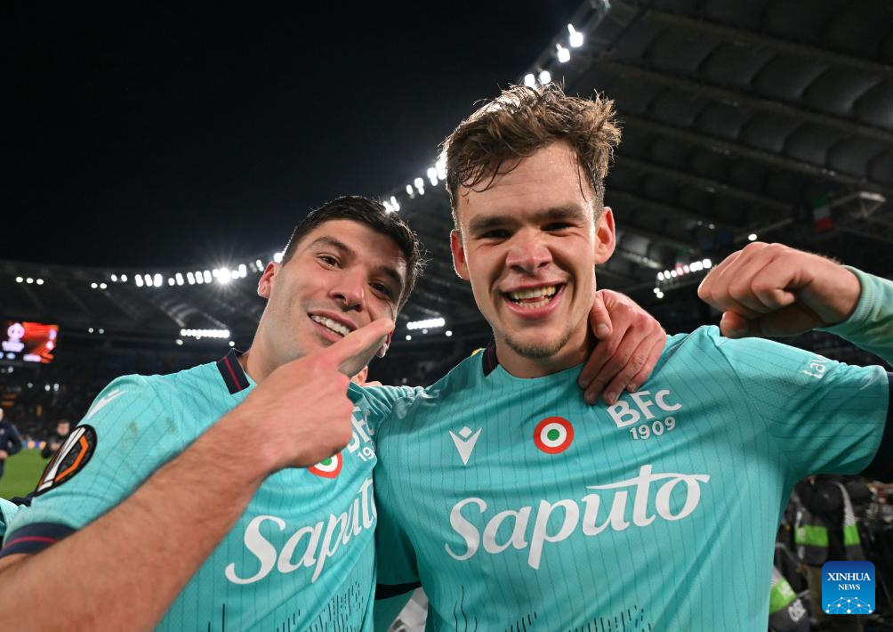 Bologna's Nicolo Cambiaghi (L) and Thijjs Dallinga celebrates after the UEFA Europa League round of 16 second leg match between Roma and Bologna in Rome, Italy, March 19, 2026. (Photo by Alberto Lingria/Xinhua)