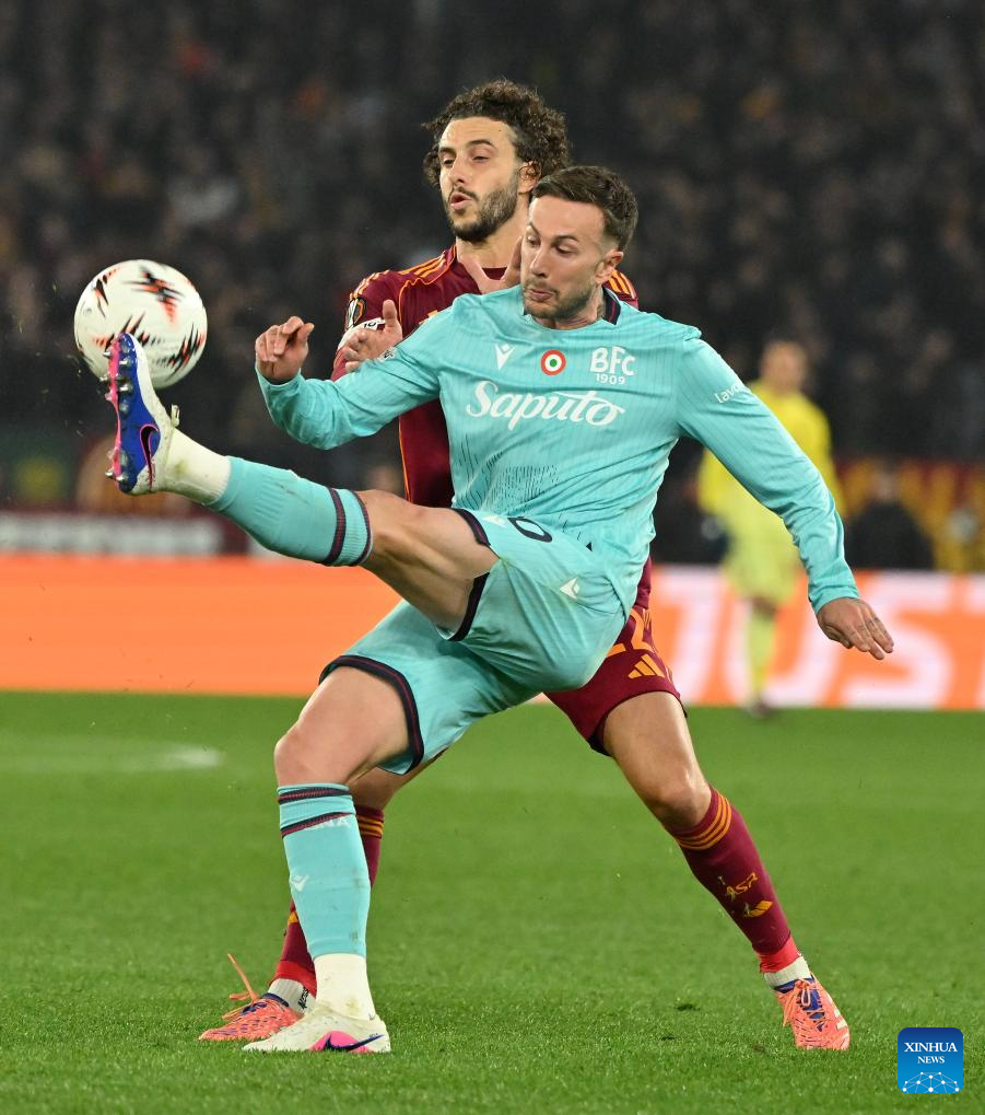 Roma's Hermoso (L) defends Bologna's Federico Bernardeschi during the UEFA Europa League round of 16 second leg match between Roma and Bologna in Rome, Italy, March 19, 2026. (Photo by Alberto Lingria/Xinhua)