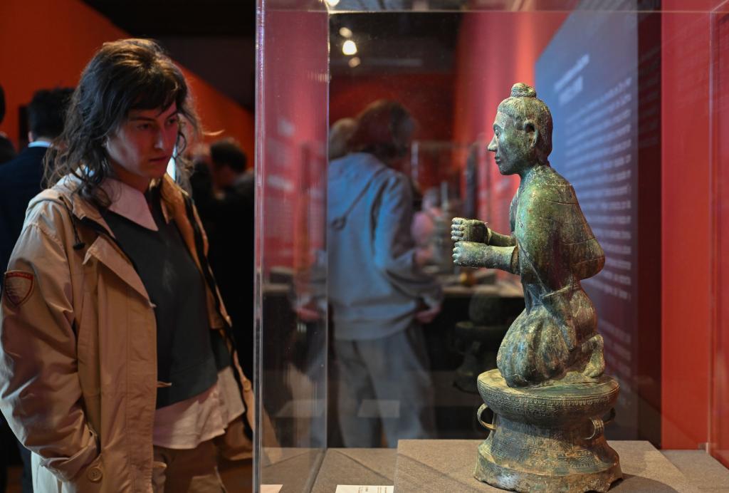 3月17日,在西班牙瓜达拉哈拉博物馆,一名女子参观中国西南地区青铜文明展上来自云南的展品执伞男铜俑。
