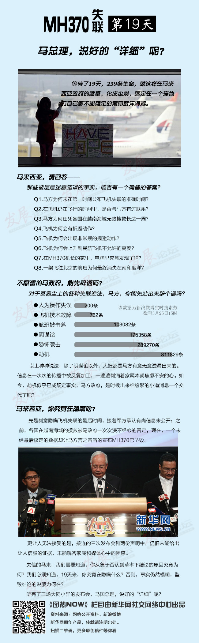 等待了19天,239條生命,就這樣在馬來西亞政府的嘴里,化成塵埃,落定在一個連他們自己都不能確定的南印度洋海域。事實(shí)仍然模糊,結(jié)論的說服力何在?馬國總理,你說好的“詳細(xì)”呢?