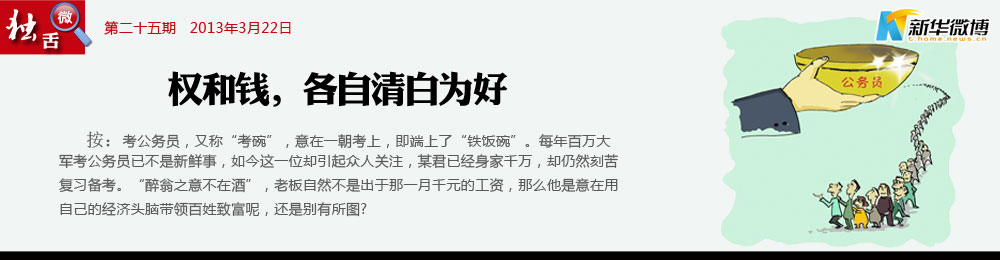 如果千萬(wàn)富翁考上公務(wù)員 千萬(wàn)富翁考公務(wù)員折射的是某些政府部門(mén)“門(mén)難進(jìn)、事難辦”的現(xiàn)狀,也反映出當(dāng)下企業(yè)的生存無(wú)奈。假設(shè)他有朝中舉,好的結(jié)果是政府吸納了一名懂經(jīng)濟(jì)的得力干將,壞的結(jié)果則是又多出一個(gè)亦官亦商的“紅頂商人”。