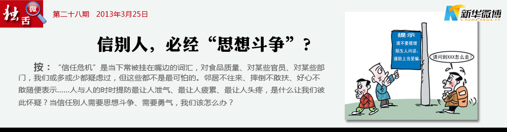 【可怕的“信任危機(jī)”】 賣包子的不吃自己做的包子,種菜的不吃自己種的菜,賣藥的不敢吃自己生產(chǎn)的藥,賣奶粉的則從不吃國產(chǎn)的奶粉……當(dāng)造假作假成為一種風(fēng)氣,甚至成為一種理所當(dāng)然時,每個人能做的就只剩兩件事了:一個是只信自己,另一個是絕不信別人。