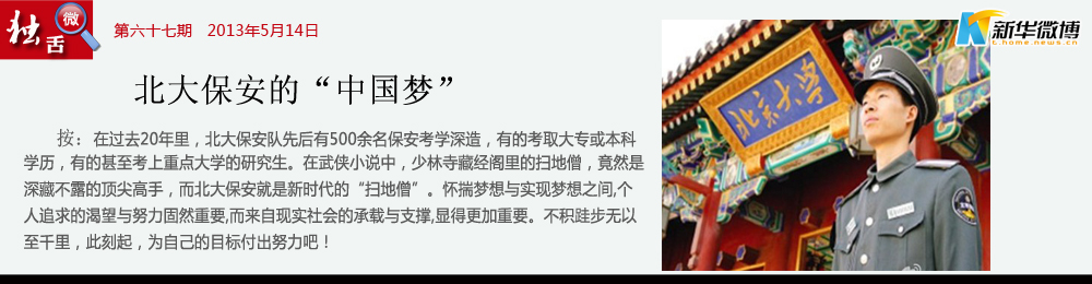 知識改變命運 中國夢是中國人的夢,而在出彩機會上,每個人都會有自己的價值標桿。北大保安們,大都是“有組織有目的”的投身北大,其實這本來就是種奮斗過程。