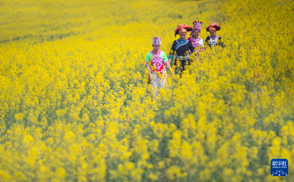 3月8日,人们在云南省文山壮族苗族自治州砚山县阿猛镇下科木村油菜花田游玩。春意渐浓,各地春花陆续绽放,神州大地春景迷人。