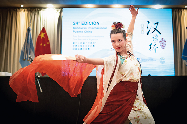 2025 年 5 月 20 日,在阿根廷首都布宜诺斯艾利斯,“汉语桥”世界大学生中文比赛阿根廷赛区决赛上,参赛选手表演舞蹈