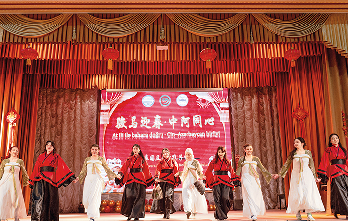 2026 年 2 月 4 日,在阿塞拜疆首都巴库举行的“骏马迎春 中阿同心”春节庆祝活动上,学生们表演舞蹈
