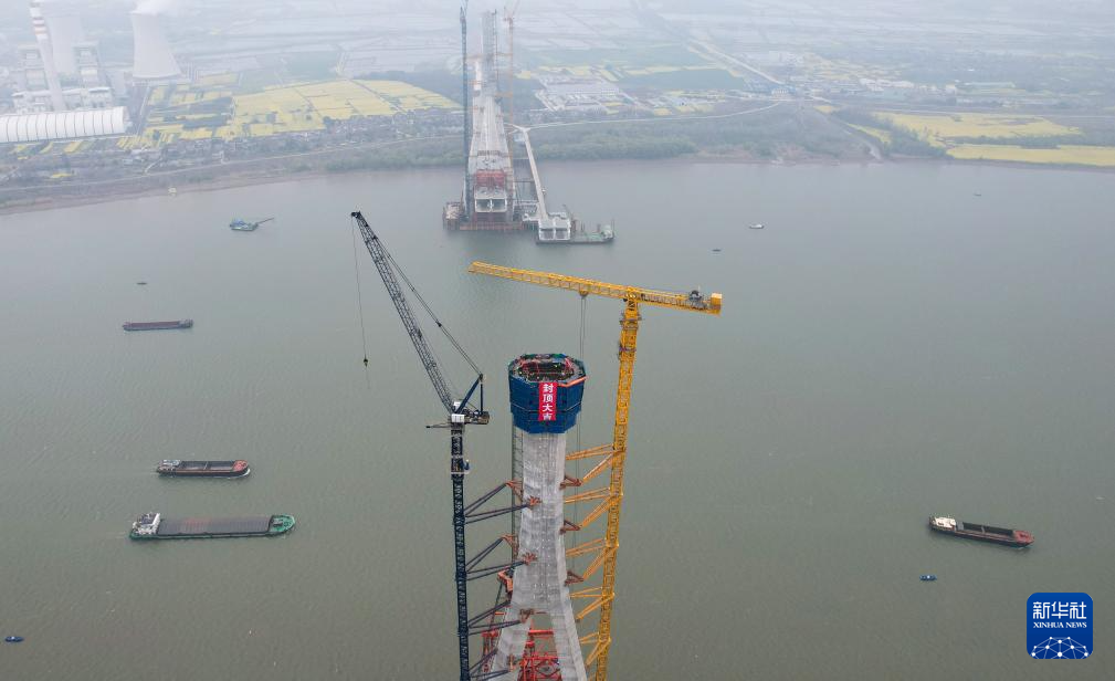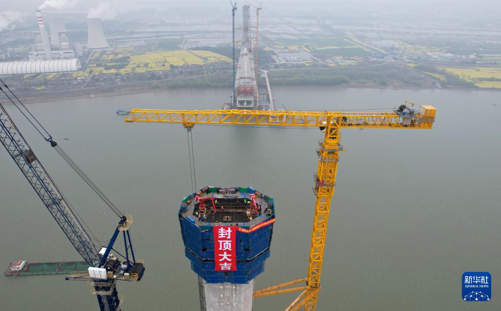 3月19日拍摄的池州长江公铁大桥北主塔封顶施工现场(无人机照片)。新华社记者 曹力 摄