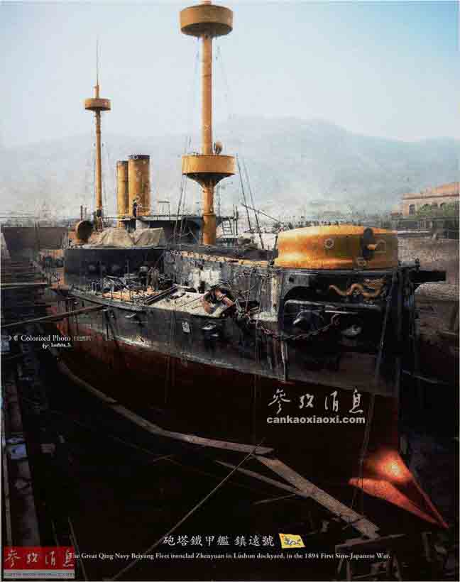 1894年,中日甲午海戰(zhàn)前夕,停泊在旅順船廠船塢進(jìn)行維護(hù)的大清帝國(guó)海軍“鎮(zhèn)遠(yuǎn)”號(hào)戰(zhàn)列艦。