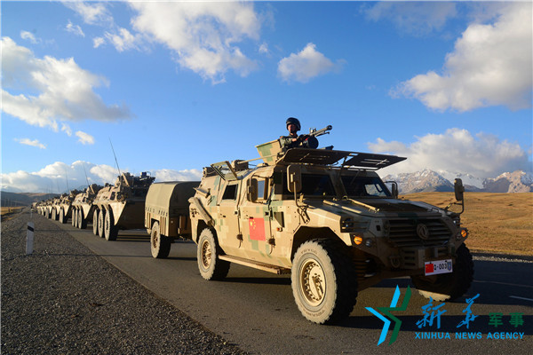 ????9月13日,我地面參演部隊(duì)采取摩托化機(jī)動(dòng)方式,于9月12日從新疆阿圖什市出發(fā),經(jīng)吐?tīng)栨靥剡吘晨诎冻鼍?,行程共約510公里,于9月13日抵達(dá)演習(xí)地域。新華社記者王德思 攝