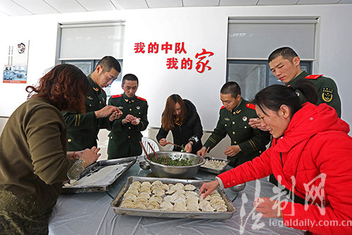 ????2017年1月22日,江蘇連云港邊檢站官兵與駐地百姓歡聚一堂,一起包餃子、做湯圓,閑話家常,其樂(lè)融融,把弄弄的軍民魚(yú)水情都包進(jìn)了餃子里。(鄭永波 錢逸帆)