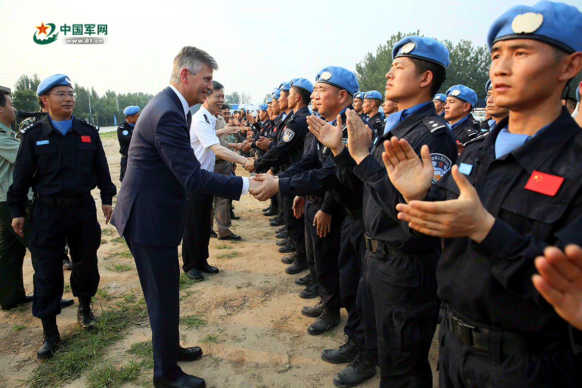 6月30日,聯(lián)合國(guó)副秘書長(zhǎng)拉克魯瓦與常備維和警隊(duì)隊(duì)員握手。