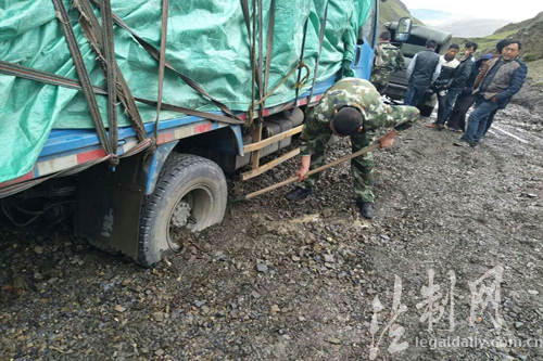 ????連日來,受強降雨天氣影響,通往西藏山南市錯那縣卡達鄉(xiāng)道路因山體塌方和泥石流損毀嚴重,7月23日中午12時,西藏邊防總隊山南邊防支隊卡達邊防派出所接轄區(qū)居民電話報警稱:商店運貨貨車在返回卡達鄉(xiāng)途中陷入泥潭,請求派出所救援。接到消息后,該所迅速組織官兵趕往現(xiàn)場,并持續(xù)關(guān)注道路情況和受困狀況。到達現(xiàn)場后,邊防官兵立即展開救援,用十字鎬挖、用手刨、用人推,經(jīng)過2個小時的不懈努力,最終成功把陷入泥坑的貨車拉出。救援結(jié)束后,邊防官兵就近取材把泥坑填平,并設(shè)立警示標志,確保后續(xù)車輛順利通過?,F(xiàn)場無人員受傷,車輛完好。