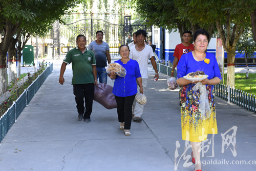????“你們平時(shí)執(zhí)勤都那么忙,每次叫你們?nèi)ノ曳孔映灶D飯都不去,現(xiàn)在總可以嘗一嘗我親手做的馓子了吧”帕提曼手拿著一把馓子遞給了桌旁的民警小王,這是發(fā)生在2017年7月26日三道河邊防派出所里的一幕,為了慶祝即將到來的建軍90周年,帕提曼與霍城縣三道河鄉(xiāng)五隊(duì)的村民帶著一些自家的東西去慰問邊防派出所的官兵,他們都有一個(gè)特殊的身份——新疆邊防總隊(duì)伊犁邊防支隊(duì)三道河邊防派出所官兵們的結(jié)對(duì)親戚們。