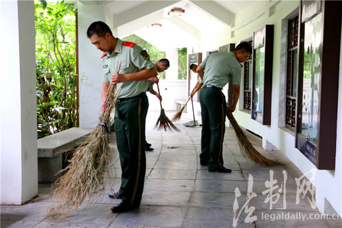 圖為臨退老兵到駐地社區(qū)公共場所義務勞動